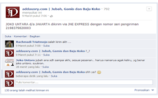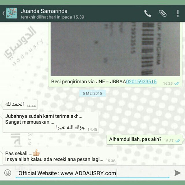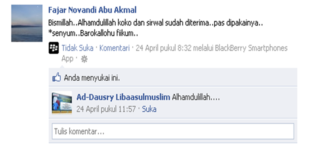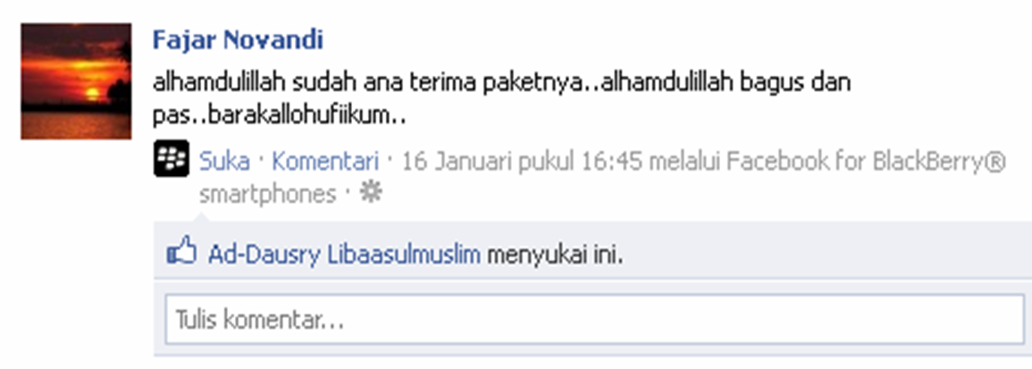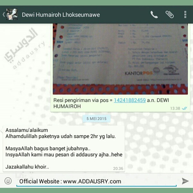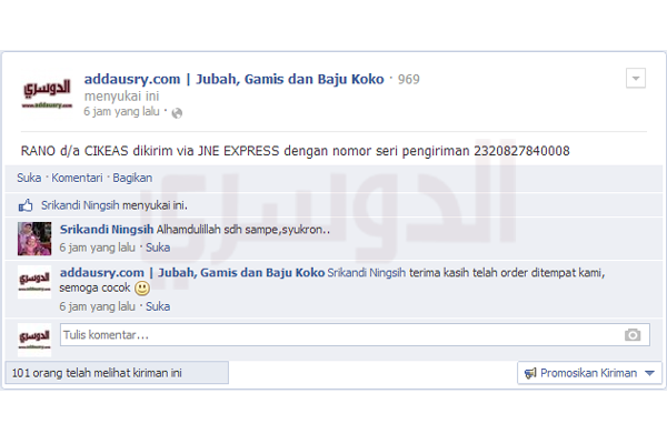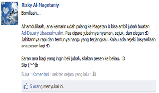 2. Sejak tanggal 23 April 2010, Alhamdulillah kami bisa menyentuh dunia maya dengan media jejaring sosial, dengan akun facebook Addausry Libaasulmuslim dan kemudian fans page facebook addausry.com | Jubah, Gamis dan Baju Koko dan juga akun Twitter @addausry