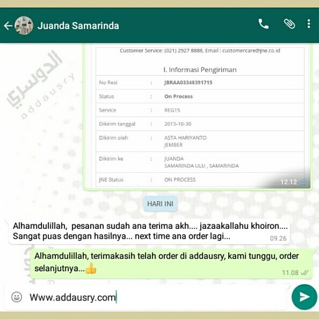 Produk pesanan akan kami kirim melalui jasa pengiriman yang terpercaya. Kami menjamin, pesanan sampai ketangan anda dengan pantauan kami selama proses pengiriman. Anda juga bisa memantau status kiriman melalui website kami www.addausry.com. Dengan pembayaran melalui transfer, kami menyediakan rekening bank BCA, MANDIRI dan BRI demi kemyamanan dan kemudahan anda dalam melakukan pemesanan. Anda juga bisa melakukan pemesanan ditenpat kami dengan pembayaran langsung ditempat.